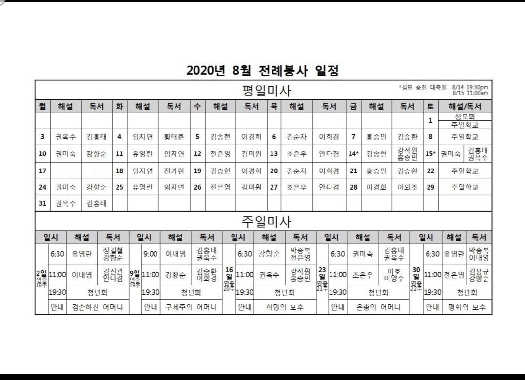 2020년 8월 전례봉사일정