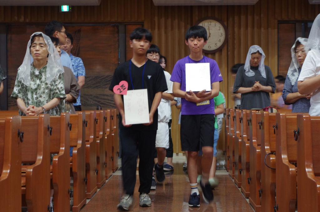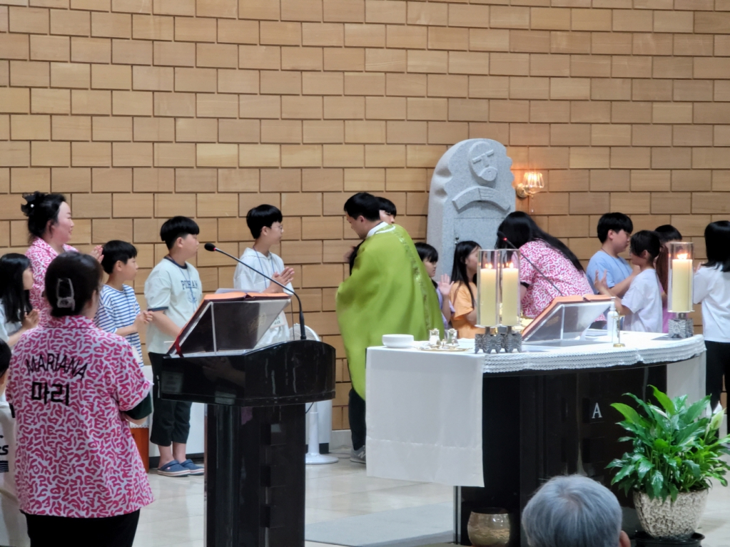 이날 미사에는 주일학교 학생들이 제단위로 올라와 신부님과 함께